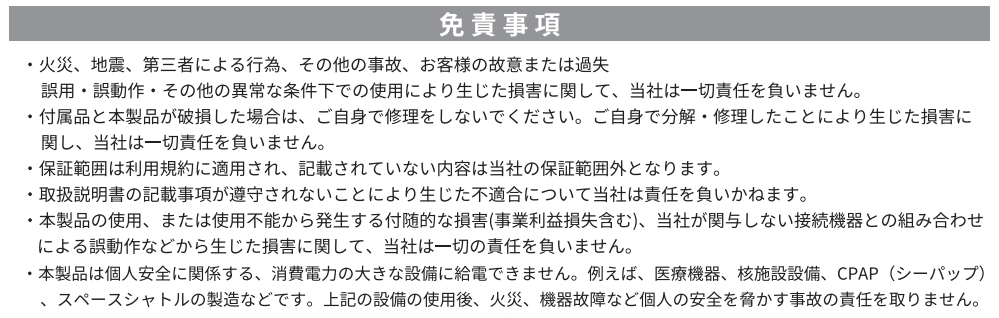 ペースメーカーについて、ポータブル電源を扱う際の注意事項について Jackery Support 2024年01月18日 06:37 Jackery ポータブル電源は個人安全に関係する、消費電力の大きな設備に給電できません。 予めご了承ください。 9041665568025.png 200 KB ダウンロード 関連記事 ペースメーカーについて、ポータブル電源を扱う際の注意事項はあるか? 電磁波はあるか? UPS/EPS機能は搭載していますか セル種類を教えてください 充電する最適なタイミングはいつ? コメント 0件のコメント サインインしてコメントを残してください。