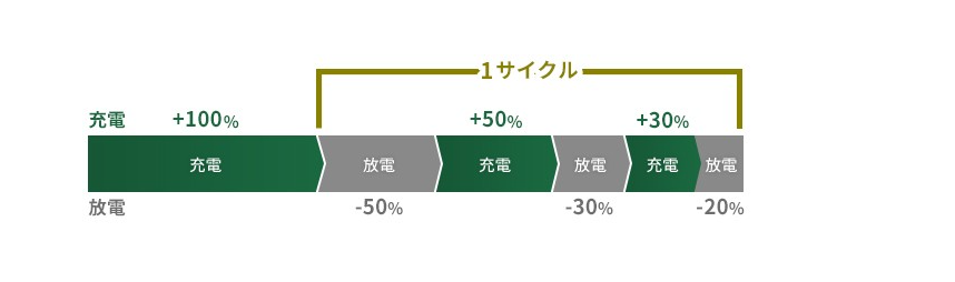 充電量の合計が100%+放電の合計が100%で1サイクルとカウントします。